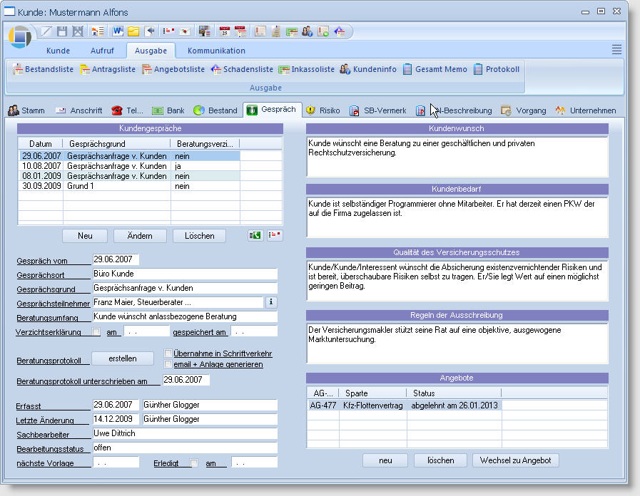 - Detaillierte Erfassung aller Kundengespräche und daraus resultierender Ausschreibungen und Angebote