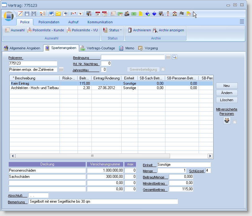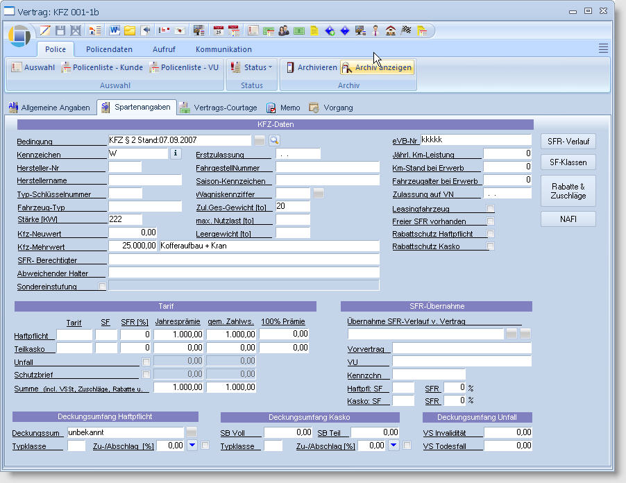 - Sehr detaillierte Eingabemasken für 14 verschiedene Sparten incl. Gruppen- und Multirisk-Tarife
