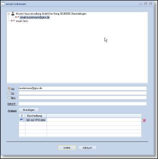 Dabei wird der Standard-Emailclient des jeweiligen Computersystems aufgerufen. Bei Verwendung von Microsoft Outlook kann das gesendete Mail automatisch in die Dokumentenverwaltung importiert werden. |