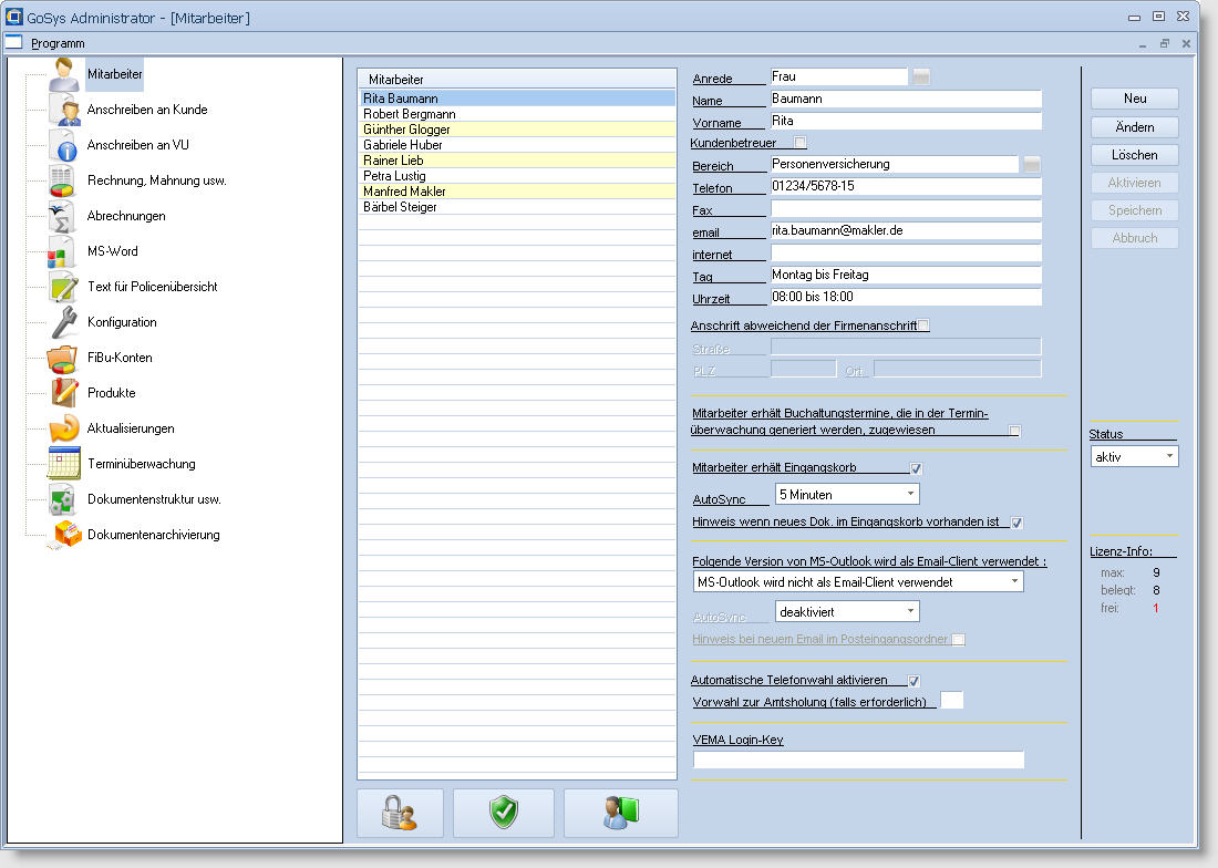 Der GoSys Administrator beinhaltet eine umfangreiche Mitarbeiter-Verwaltung. Detail |