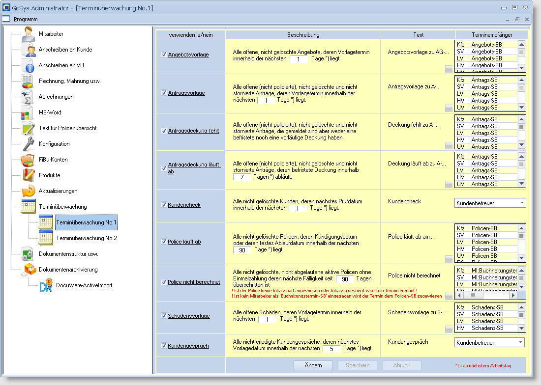 Die mit dem Modul 'Terminüberwachung' automatisch generierten Termine werden im GoSys Administrator einzeln definiert. Detail |