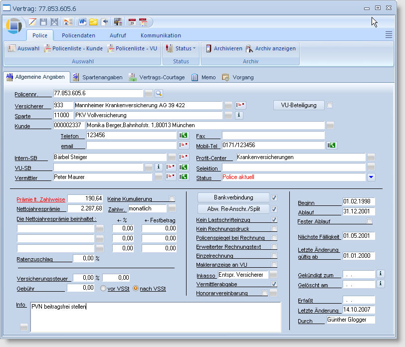 Alle relevanten Daten eines Vertrages werden erfasst und gespeichert. Dazu stehen für insgesamt 14 verschieden Sparten jeweils mehrere Eingabemasken zur detaillierten Beschreibung des Vertrages bereit. Jedem Vertrag können beliebig viele Angebote und Anträge ( Neu- und Änderungsanträge ) zugewiesen werden. Detail |