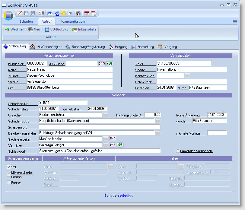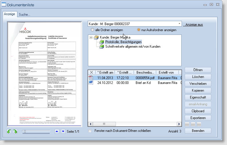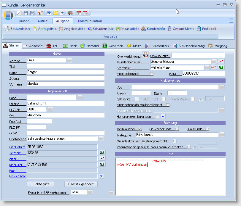 In mehreren Masken werden alle Daten eines Kunden sehr detailliert erfasst. Mit einem Klick kann seine Bestandsliste, Schadenliste, Buchungsliste, Terminliste, Dokumentenliste etc. aufgerufen werden. Mit einem weiteren Klick wechselt man daraus in den gewählten Vertrag, in das angezeigte Dokument usw. Es können beliebig viele Kunden zu Gruppen zusammengefasst werden Detail |