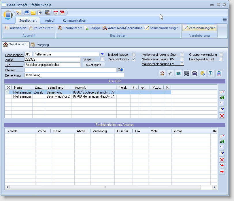 Es können beliebig viele Gesellschaften mit ebenso beliebig vielen Anschriften verwaltet werden. Bei jeder Anschrift können wiederum uneingeschränkt viele Sachbearbeiter mit allen benötigten Daten (Name, Position, Telefon, email usw.) gespeichert werden. Auch Versicherungsgesellschaften können zu Gruppen zusammengefasst werden. Detail |