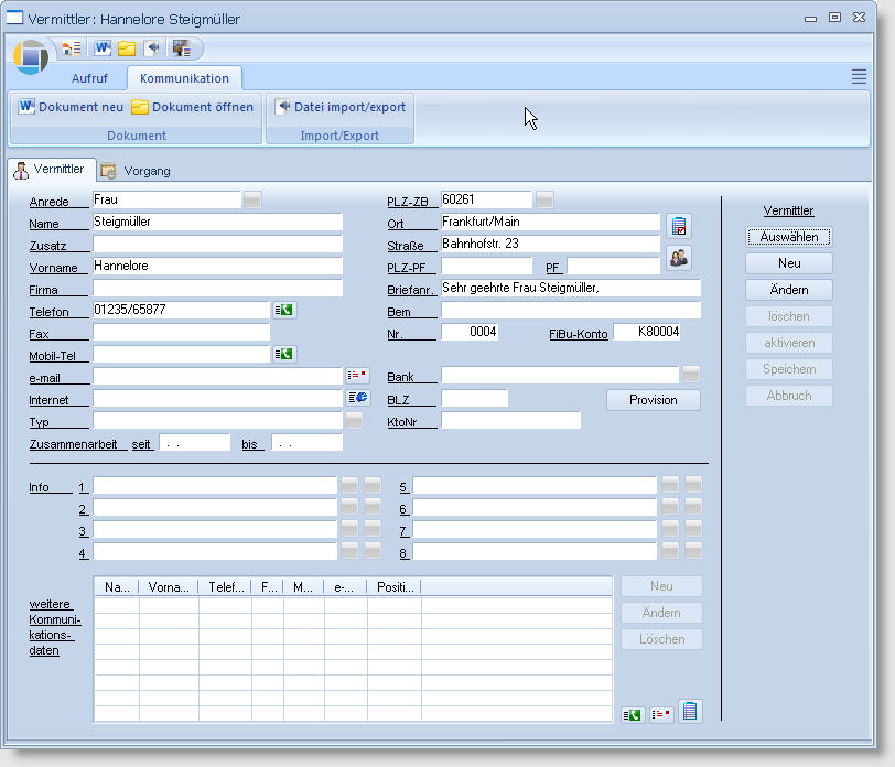 In GoSys Ultimate können beliebig viele Vermittler mit allen benötigten Daten wie Anschrift, Kommunikation, Bankverbindung und Provisionsvorgaben erfasst und verwaltet werden. Detail |