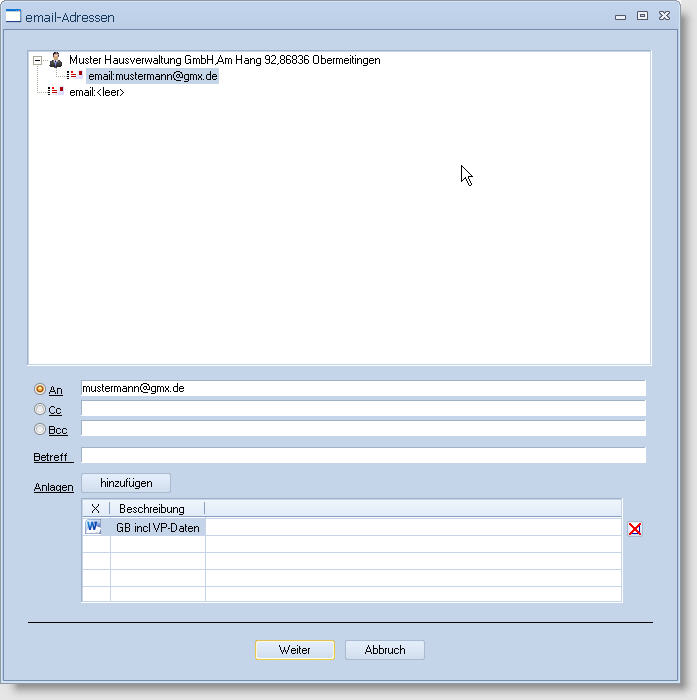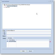 Überall dort wo in einer Eingabemaske eine Email-Adresse erscheint, kann daraus per Mausklick ein neues Email generiert werden. Dabei wird der Standard-Emailclient des jeweiligen Computersystems aufgerufen. Bei Verwendung von Microsoft Outlook kann das gesendete Mail automatisch in die Dokumentenverwaltung importiert werden. |
