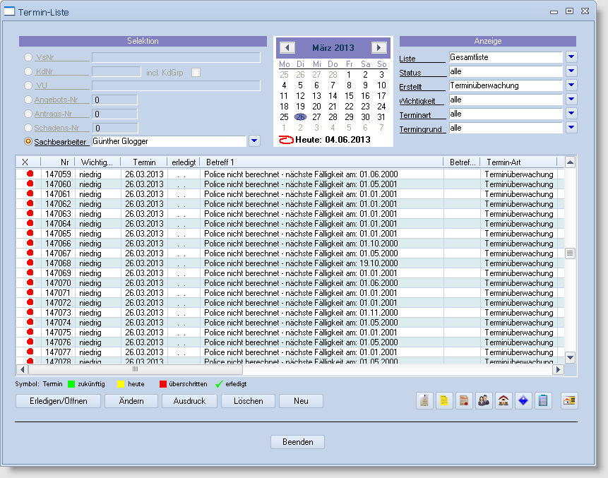 Zu jedem Kunden, Vertrag, Antrag, Schaden usw. können frei definierbare Termine in beliebiger Anzahl vergeben werden. Neben den Terminen die manuell eingegeben werden können, werden vordefinierte Termine mit Hilfe des Terminverwaltungs-Tool's auch automatisch generiert. Detail |
